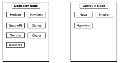 Controller Node와 Compute Node의 구성요소는 [그림 2-1]과 같다. Controller Node는 openstack을 제어하기 위한 각 구성요소가 포함되어 있으며, Storage Node의 기능을 포함한다.