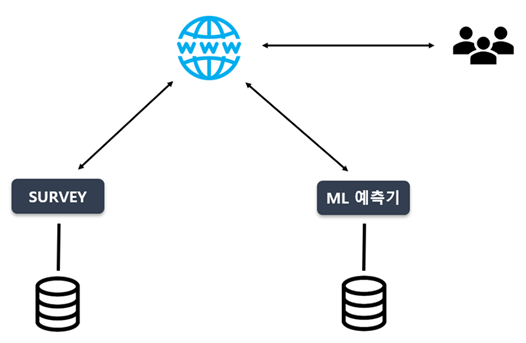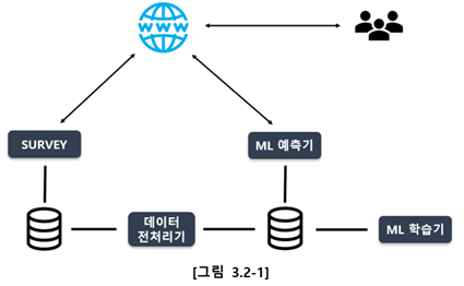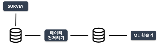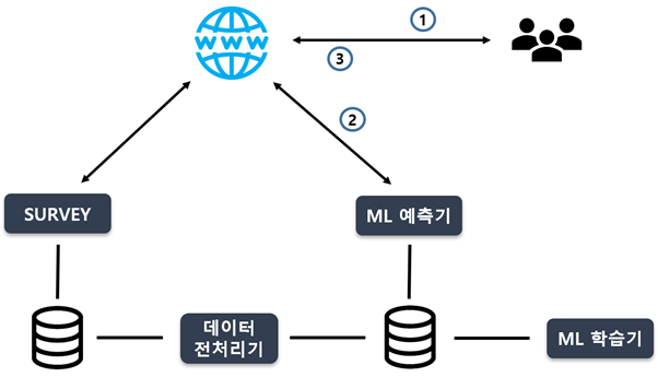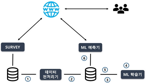 기계학습 모델을 만드는 부분은 데이터 전처리기, ML 학습기, storage로 구성된다. 데이터 전처리기는 설문조사 데이터를 ML에서 사용할 수 있게 전처리하는 역할, storage에 전처리 데이터를 저장하는 역할을 한다. ML 학습기는 전처리된 데이터를 학습하고 생성된 ML 모델을 storage에 저장하는 역할을 한다.