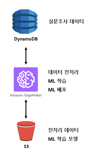 확장될 ML 서비스의 AWS구성도는 [그림 1]과 DynamoDB, Amazon SageMaker, S3로 구성된 다. DynamoDB에는 설문조사 데이터가 저장되며, Amazon SageMaker를 통해 데이터 전처리, ML 학습, ML 배포의 모든 기계학습 부분을 처리한다. Amazon SageMaker에서 생성된 전처리 데이터 와 ML 학습 모델은 S3에 저장된다.
