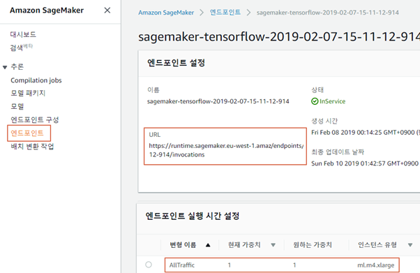 [그림 3.4-10]과 같이 Amazon SageMaker의 [추론]-[엔드포인트] 탭에서 생성된 앤드포인트와 접 근가능한 URL을 확인할 수 있다.
