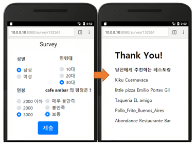 기존의 설문조사 서비스는 [그림 3.4-13]에서 보이듯이 고객의 설문응답 만을 받는 WEB UI를 제 공하였다. 서비스 확장에 따라 WEB UI에서 설문자의 연령대를 기준으로 ML 예측 Serving endpo int에 특정 레스토랑의 예상 평점을 요청하여 [그림 3.4-14]와 같이 상위 5개의 레스토랑을 보여 주는 서비스로 변경되었다.