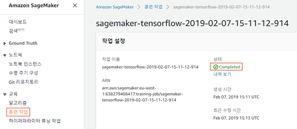 학습을 시작하면 Amazon SageMaker의 [교육]-[훈련 작업] 탭에서 [그림 3.4-4]과 같이 작업 중 인 훈련을 볼 수 있다.