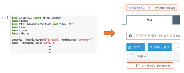 [그림 3.4-1]과 같이 Python boto3 api를 통해 설문조사 데이터가 저장되어 있는 DynamoDB survey 테이블에 접근하여 필요한 데이터만 S3에 저장한다.