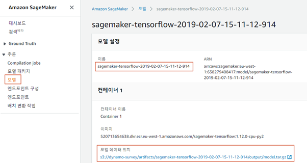 [그림 3.3-9]과 같이 Amazon SageMaker의 [추론]-[모델] 탭에서 생성된 모델과 저장된 위치를 확인할 수 있다.