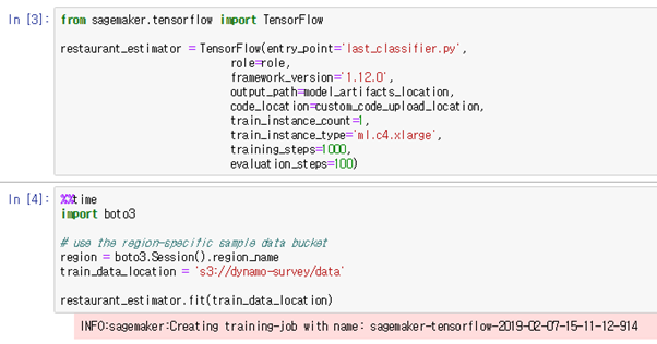 [그림 3.4-3]과 같이 알고리즘, 학습 인스턴스의 HW스펙, 학습 단계 등을 설정하여 ML 학습기 (estimator)를 만들고 학습 데이터가 위치한 S3 경로를 입력하여 학습을 시작한다.