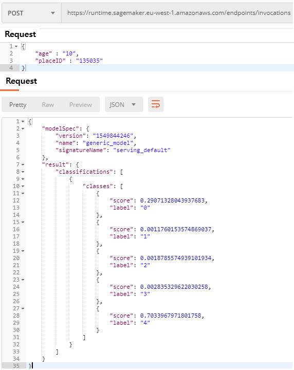 Python api가 작동하여 예측이 정상적으로 이루어 진다면 [그림 3.4-12]와 같이 endpoint의 HTTP URL을 통해 예측 API를 호출하여 테스트한다.